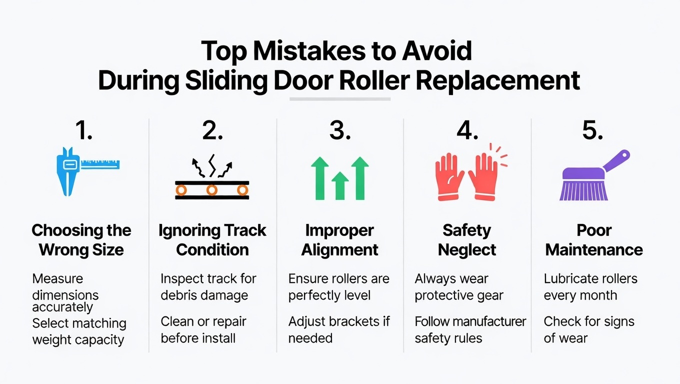 การเปลี่ยนลูกกลิ้งจะทำงานได้ดีที่สุดเมื่อคุณถือว่าเป็นการรีเฟรชระบบ: ขนาดลูกกลิ้งที่ถูกต้อง แทร็กที่สะอาดและเสียง การปรับความสูงอย่างระมัดระวัง และการจัดการแผงควบคุมอย่างปลอดภัย การหลีกเลี่ยงข้อผิดพลาดทั่วไป เช่น ชิ้นส่วนที่ไม่ถูกต้อง การละเลยสภาพของราง/เฟรม และการปรับที่ไม่สม่ำเสมอ ช่วยปกป้องฮาร์ดแวร์ของประตู ปรับปรุงการวางแนวล็อค และคืนสภาพการเลื่อนที่ง่ายดายอย่างที่ประตูบานเลื่อนควรจะมี